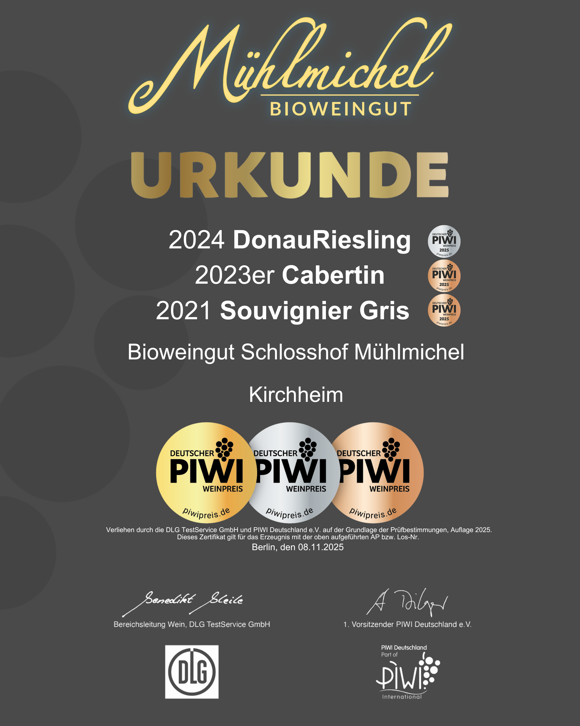 Beim diesjährigen PIWI Deutschland Verkostungswettbewerb (DLG) konnten wir gleich drei Auszeichnungen mit nach Hause nehmen – ein großartiger Erfolg für uns.